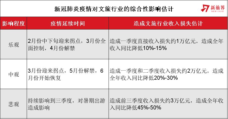 根據(jù)文旅部數(shù)據(jù)中心統(tǒng)計,2019年上半年旅游總收入為2.78萬億元,按上半年收入損失2萬億元估算,上半年將導致旅游總收入同比降低約30%,如果下半年高速反彈,全年營收負增長可以收窄到25%;如果下半年迎來重大利好,出現(xiàn)報復式反彈,預計負增長可以控制到20%左右。